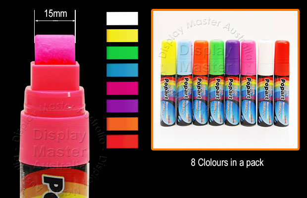 Pack of 8 liquid chalk marker pens with 15mm with chisel tips (Blue/ Yellow/ Green/ Purple/ Red/ White/ Pink/ Orange).
